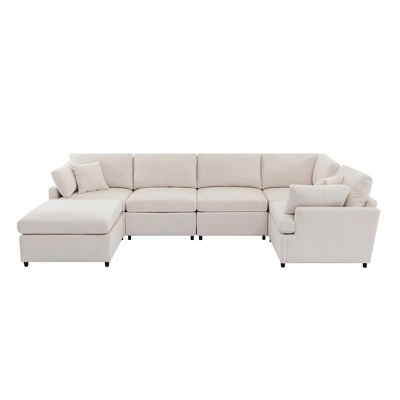 Experience ultimate comfort and versatility with our 6-seat 100″ Wide U-shaped sectional Sofa. Designed to adapt to your living space, this sectional sofa features a reconfigurable ottoman that can be easily rearranged to meet different seating and lounging needs. Crafted from durable plywood and solid wood, it is built to last. The high-density rebound PP cotton filling provides exceptional comfort and support, while the skin-friendly fabric upholstery ensures a cozy and inviting feel. The cushions come with convenient zippered covers, making them easy to remove and clean. This sectional sofa combines functionality, durability, and style, making it a perfect addition to any home.
