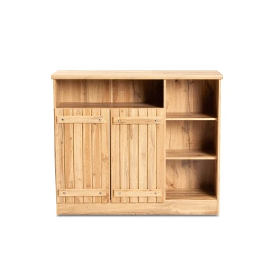 Imbue your dining room with the cozy farmhouse charm of the Eren sideboard. Made in Malaysia, the Eren is comprised of sturdy wood finished in a stunning natural oak brown hue. Four open shelves and three additional shelves, behind two doors, provide ample storage space to easily organize your plates, glassware, and more. Requiring assembly, the Eren is fitted with paneled wood doors that lend a cozy farmhouse aesthetic. Add utility and style to your dining space with the Eren sideboard.