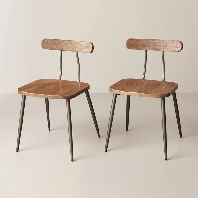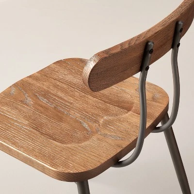 Create a sleek and comfy dining setup with the Industrial Wood & Steel Dining Chairs from Hearth & Hand™ with Magnolia. The armless dining chair set is set on four black sleek metal legs and back with aged oak wooden seat and headrest for added interest — allowing you and your guests to fully relax while enjoying meals. Add these wood dining chairs to your dining space along with a round dining table to bring clean-lined style in your home.