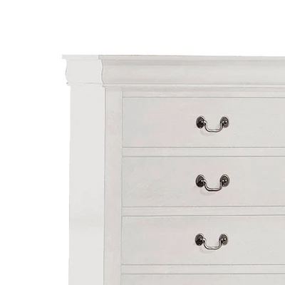 Bring casual elegance into your home with the Louis Phillipe bedroom collection. The Louis Philippe Chest in white finish is equipped with brushed nickel metal hardware that lends antique elegance. Store bedding, clothing, and more in the five roomy drawers. Choose from available finish options to best coordinate with existing bedroom furniture.This five drawers chest offers any bedroom a sophisticated look. Finished in classic finish with metal hardware, the simple moldings and luxurious pull handles add subtle style and appealing detail to each piece.