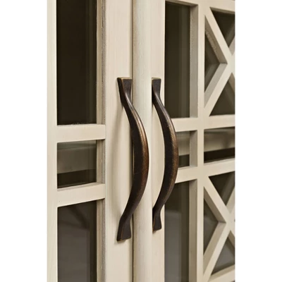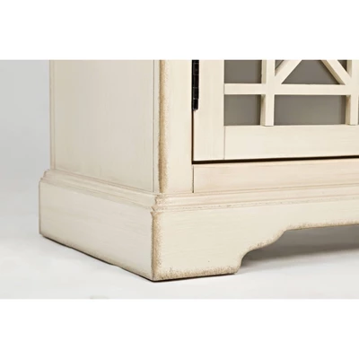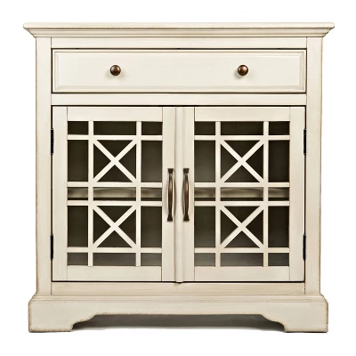 A perfectly handcrafted piece of traditional English cottage inspired decor, this exquisitely designed accent chest cabinet is sure to embolden your living space with a classic sense of charm and sophistication. Made using premium quality acacia wood, this piece has an antique white finish that brings a distinctly elegant appeal to your dining room, living room or kitchen. It is also equipped with spacious storage options, including one large drawer and a double door cabinet with two roomy compartments inside, sectioned off beautifully with crossed wood and glass panels. Check our Koi collection for matching items. Dimensions: 15x32x32