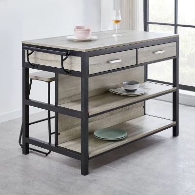 Function, style and compact design are the hallmarks of the Carson dining set. This counter-height dining set packs a lot of features in a small area dining set with seating for two, ample display area and dual towel racks for quick cleanup. This set works great as a room divider in a loft or for a cozy seating area while the weathered driftwood finish is sure to complement any home interior. Your purchase includes one counter height table and two counter height stools.