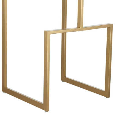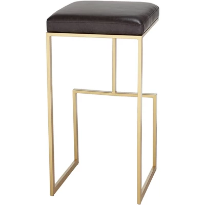 This modern bar stool offers eye catching luxe style for your decor. The open frame design features minimal lines and a sturdy metal construction. A crossbar joins the two legs and functions as a foot rest. The gold finish frame offsets nicely with the faux Brown leather seat, which has stitched detailing. Non-adjustable bar height stool.