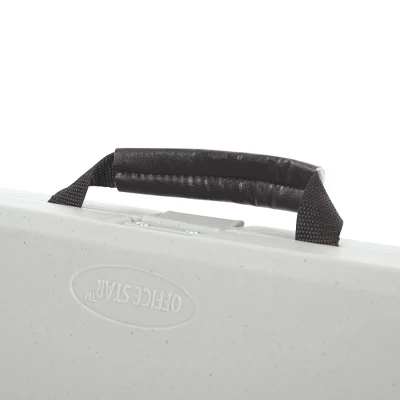 - The center fold table includes a locking latch along with a handy built-in handle for easy set-up and transportation