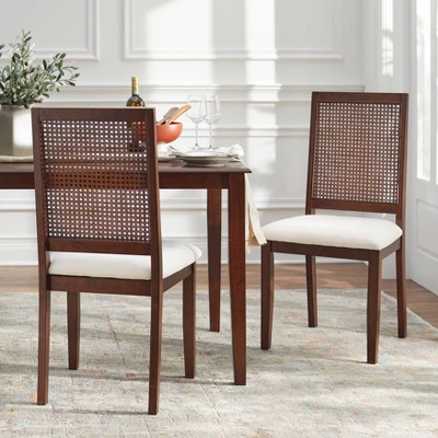 Timeless sophistication brings liveliness to your dining room with the 5Pc Westmont Rectangular Dining Set from Lifestorey. Simple lines allow this table to work great with many styles of interiors. Subtle taper solid rubberwood legs along with a tabletop constructed of MDF with beautiful wood veneers, highlight the rich wood grain in a rustic brown finish. Chairs feature textured cane high backs for added dimension and uniqueness. Cushioned upholstered chair seats in a crisp white soft velvet fabric are constructed with solid rubberwood in a rustic brown finish. This set is the perfect complement to any modern farmhouse or traditional style dining space. Set includes one table and four chairs.