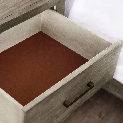 Redesign your dream nesting space with this six-piece bedroom set. Antique nickel hardware adds a touch of old-world charm to your bedroom while complementing the earthy brown finish. Organize your linen and other bedroom essentials in the nightstands and dresser’s felt-lined, soft-closing drawers. Crafted with a solid wood frame and a stunning tufted linen upholstery, the bed will draw the eye to bring everything together.