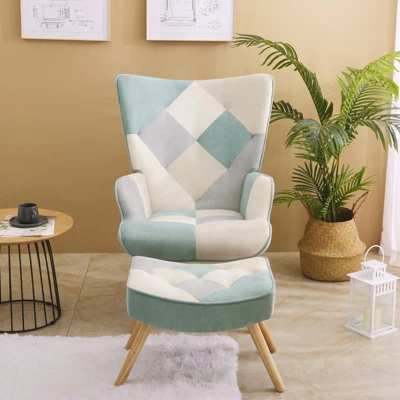 - This accent chair with ottoman set has a creative splicing cloth surface and curved tall back. It¡¯s the design makes it eye-catching and beautiful, compared with other chairs. Otherwise, the armchair also can be used as home decoration