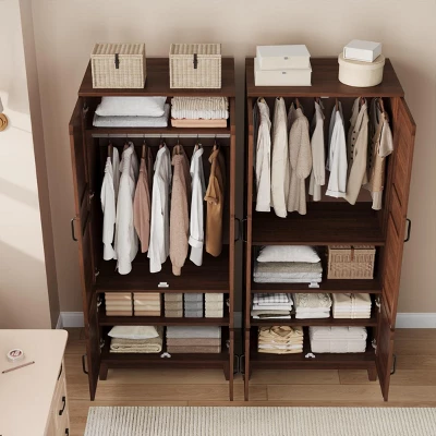 - Armoire Wardrobe with Adjustable Shelf: Keep your bedroom or apartment tidy and organized with this stylish wooden armoire wardrobe. Featuring 4 sturdy doors and a fully customizable interior, it includes one adjustable shelf offering 18 height settings—perfect for tailoring your storage space to suit your needs. Remove the shelf to hang long coats and dresses, place it in the middle for shorter garments, or split the space with hanging rods below and shelves above.