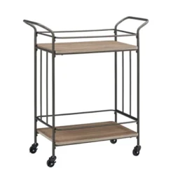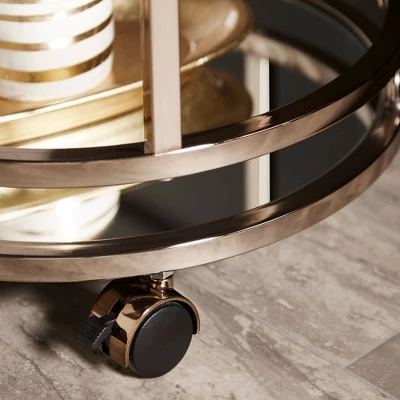 Set the stage for a glitzy, roarin’ 20’s look within your living space with the Inspire Q Bartram Oval Bar Cart. This beautiful cart is the perfect place to keep all your party and cocktail essentials with it’s mirrored top and bottom shelves. A glistening, champagne gold metal frame ties the cart’s design together perfectly by adding a timeless, glam look to your home’s décor, while caster wheels allow the cart to be easily maneuvered from room to room.