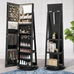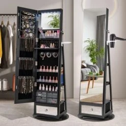Tangkula 360° Rotating Mirrored Jewelry Cabinet Armoire 3 Color LED Modes Lockable Black