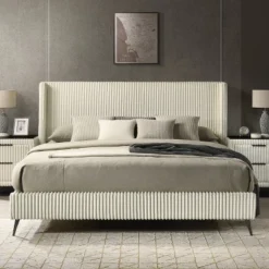 Roundhill Furniture Mavela Wide-wale Corduroy Upholstery Panel Bed With 2 Nightstands