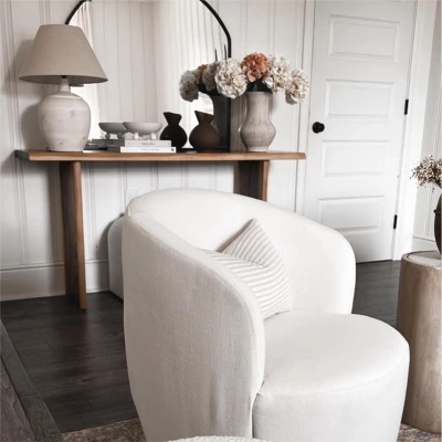Introducing our stunning Linen Swivel Chair, a beautiful and versatile seating option that combines style and functionality flawlessly. Inspired by the latest trends, this chair offers a perfect blend of casual elegance and modern design.Crafted with utmost attention to detail, the Linen Swivel Chair features a 100% fully upholstered waterfall farmhouse style that adds a touch of sophistication to any space. The curved back and armrests provide exceptional comfort, allowing you to relax and unwind in style.The high-quality linen-blend upholstery not only offers a smooth and comfortable feel but also adds a subtle texture and visual interest to the chair. The fabric is both durable and easy to clean, making it ideal for everyday use and ensuring long-lasting beauty.Equipped with a convenient 360° swivel base, this chair allows you to effortlessly rotate and move around, providing flexibility and making it suitable for various rooms. Whether you want to create a cozy reading nook in your living room, add a stylish accent to your bedroom, or enhance the functionality of your home office, the Linen Swivel Chair is the perfect choice.Available in a range of timeless colors, the Linen Swivel Chair complements a wide variety of interior styles, from modern to farmhouse-inspired decor. Its fully assembled structure ensures hassle-free setup, allowing you to enjoy the chair’s comfort and charm right away.