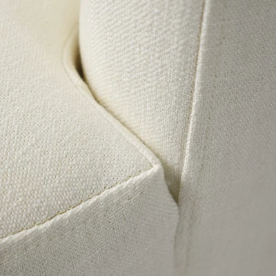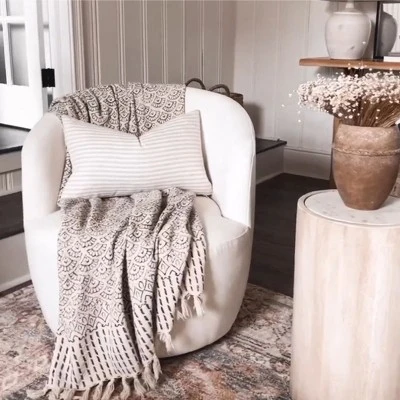 - The Linen Swivel Chair is available in a range of timeless colors, including blush, blue, and beige.