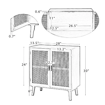 Still struggling with space organization? This cabinet provides a perfect choice for you. Easily keeping clutter under control with this cabinet constructed of solid wood in a classic finish. Behind its double rattan doors with metal edge pulls is a hidden storage area that includes two spacious shelves, providing a plenty of storage and multiple layers to sort out. This solid wooden frame standing atop four legs features a long using life with perfect stability and durability. Blending perfectly with your home decor in every style?this piece helps you to create functional living room, dining room or bedroom storage options. Item Size:28Wx13.5Dx30H
