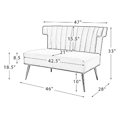 This loveseat brings a delicate silhouette and tailored touch to your living space. This is the classic and contemporary style accent loveseat with glam nailhead trim and shiny golden legs. Made with premium velvet fabric, comfortable for skin touch, and features an on-trend solid hue that bound to blend in with your color scheme. Foam filling and springs in the seat give you just the right amount of support as you sit. This loveseat features an armless design and a channel-tufted back. We love how its wingback style and nailhead trim add a refined finish. Use this space-conscious piece as an accent in your living room or spare seating for your bedroom. Item Size: 46″Wx28″Dx33″H, Seat Size:42.5″Wx21″Dx18.5″H.