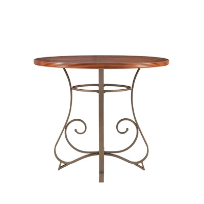 This Gathering Table features an interesting curve and scroll designed bottom. The top is a sleek “Brushed Faux Medium Cherry” wood, while the bottom is a “Matte Pewter and Bronze” metal. This piece is sure to add interest and ample table space to any home decor. The perfect piece for your family to gather around. Some assembly required.