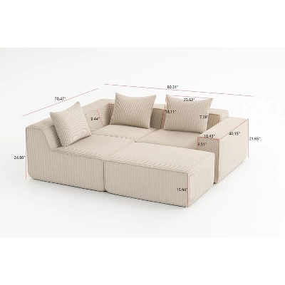 Crafted with elegant corduroy fabric featuring a soft vertical ribbed texture, this sofa offers a sophisticated look, cozy comfort, and easy maintenance. Its streamlined, all-compressed design provides a space-efficient minimalist profile ideal for modern apartments, living rooms, or home offices. The distinctive corner (C) section adds unique visual interest with a horizontal texture and varied armrest heights, emphasizing its custom design. Ready to use immediately with no assembly required, the vacuum-packed cushions expand fully within 72 hours—gently massaging them accelerates fluffiness and comfort. For upkeep, kneading the cushions restores shape, and a gentle iron smooths fabric wrinkles for a polished appearance.