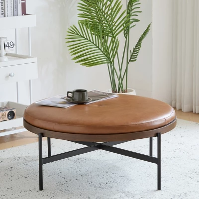 This stylish ottoman seamlessly blends modern aesthetics with practical functionality, making it an ideal centerpiece for your living room or lounge. Built with a strong black metal base and a durable manufactured wood frame, it delivers lasting strength and stability. The drum-shaped silhouette features a plush, foam-padded top that combines comfort with timeless elegance. Its spacious open base offers convenient storage for baskets, blankets, or other essentials, helping you maintain a clutter-free space. Measuring 36″ in diameter, this versatile piece doubles as a footrest, additional seating, or a chic coffee table with room for a decorative tray. A perfect fit for contemporary and modern spaces alike.