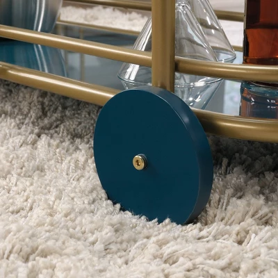 Who doesn’t love the perfect bar cart? We sure do! Create a one-of-a-kind aesthetic in your home with the unique design and charming good looks of this bar cart from the Coral Cape collection. This metal bar cart features three safety-tempered glass shelves. The spacious top shelf provides you with the room you need for various items like glass bottles, stacks of napkins, a bowl of limes, and a yummy cheese tray. The middle shelf provides you with the perfect amount of additional space for items like straws and glasses. Don’t worry, there’s still more storage. The large lower shelf provides you with even more space for other miscellaneous items. For an added touch of style, this gold bar cart features a banana leaf abstract pattern on the middle shelf and a teal tinted silk-screened glass on the lower shelf. This modern bar cart is constructed from a powder coated metal frame for added style and durability. Other features include front casters for easy mobility throughout your home. Finished on all sides in Satin Gold, this stunning bar cart is just what you’ve been missing for your next party.