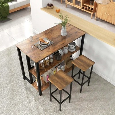 Costway 36″ Tall 3-Tier Bar Table With Storage Metal Frame Adjustable Foot Pads Rustic Brown/Grey