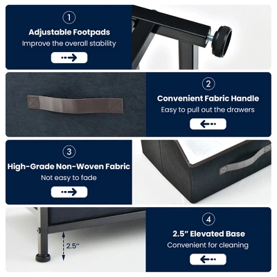 - Robust Metal Frame: The main frame of the storage dresser is made of high-grade metal, which resists well to deformation. And its plastic sprayed surface effectively avoids rust for long service life. The footpads are adjustable to keep the whole dresser more stable. Apart from that, the dresser organizer comes with anti-toppling devices for higher stability.