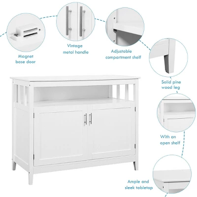 This is our kitchen storage cabinet, which is a perfect to fit your kitchen or dining room and provides you with a unmatched convenience. It features a big two doors storage cabinet for all your kitchen gadgets and tools, making it a tremendous value as well as a great space saver for your kitchen. It come with a spacious top and an open shelf that is great for storage or display. Plus, the solid wood construction provides years of sturdy and reliable use. Host dinner parties and prepare great meals with this wonderful kitchen cabinet!