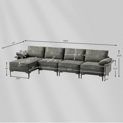 - Enhanced Weight Capacity with Stable Structure: Each seat can take the maximum weight up to 660 lbs thanks to the high-quality design. And this sectional sofa is supported by the metal legs with anti-skid plastic foot pads to ensure lasting stability. The whole sofa couch measures 130.5” x 51” x 33.5” (L x W x H).