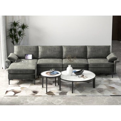 This L-shaped sectional sofa has back power strips for powering phones, including outlet x 1, USB port x 2. and the reversible chaise can be placed on either side of the sofa. The soft upholstery is made of skin-friendly linen fabric with softness, warmth, breathability and fabric absorption. And the high-density sponge filling and elastic spring system upgrade the comfortable level. This modern living room sofa couch comes with 4 boxes and may be delivered on different days. Once assembled, it is stable and has a total weight capacity of 2640 lbs. The stable metal legs also make the couch stable and sturdy with non-scratch foot pads to protect your floors. In addition, reaching your hands into the gap of the back and seat cushion, you can feel hidden storage boxes down there.
