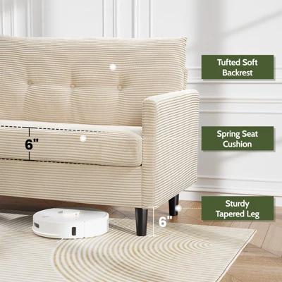 small loveseat sofa comes with 24″ extra deep seat cushion for a larger spacious area to let you get relaxed and fully unwind after a busy day. 6″ extra thick cushion makes you feel sink into a cloud when you sit down! Whether you’re watching TV, reading books, or chatting with family, this small couch will provide you with unparalleled comfort experience. This small sofa has a one-piece fluffy backrest with unique tufted button design. Its clean, minimalist design makes it a timeless centerpiece to decorate any of your home space. With a 8¡± thickness, the back cushion is super comfortable and filled with slow-release high density foam, which give your back great support and relieve your pressure from neck to legs. Corduroy is soft, comfortable, hard-wearing and breathable. These distinctive ridges give corduroy its signature look and feel, adding both visual and tactile interest. When you lie down on the modern loveseat sofa with your cheek touching it, you will feel the warmth and security. The luxurious appearance of this loveseat can make it your bright life partner. This 50¡± small couch will fit any small spaces like small apartment, bedroom, office, study room, guest room, children playroom