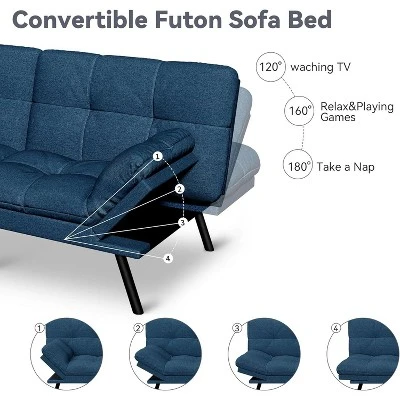 - This adaptable Futon Sofa Bed is your living room’s new best friend. It quickly converts from a comfortable sofa to a relaxing lounger or a full 71″ bed. With 3 backrest positions and 4 armrest settings, this Convertible Couch meets all your comfort needs. Experience superior relaxation on our Sleeper Loveseat.