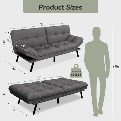 This adaptable Futon Sofa Bed is your living room’s new best friend. It quickly converts from a comfortable sofa to a relaxing lounger or a full 71″ bed. With 3 backrest positions and 4 armrest settings, this Convertible Couch meets all your comfort needs. Experience superior relaxation on our Sleeper Loveseat. The core is padded with thick, high-density foam that balances soft comfort with firm, ergonomic support. It’s designed to hold its shape, providing a consistently comfortable spot for daily use. Crafted with a sturdy wood frame and 6 durable metal legs, this futon offers exceptional stability. Its impressive 600 lbs weight capacity ensures this Sleeper Sofa can safely accommodate 2-3 adults without any wobbling or strain. Upholstered in high-quality Linen Fabric, this couch offers a soft, textured feel that’s both cozy and inviting. The breathable material promotes air circulation, keeping you cool and comfortable in any season, making it a perfect choice for extended lounging. Perfectly scaled for apartments and guest rooms (Sofa: 71″L x 33″W, Bed: 71″L x 42″W). This futon makes setup simple. All hardware is conveniently stored in the zippered pocket underneath. You can assemble it in just 15 minutes and start enjoying your new furniture.