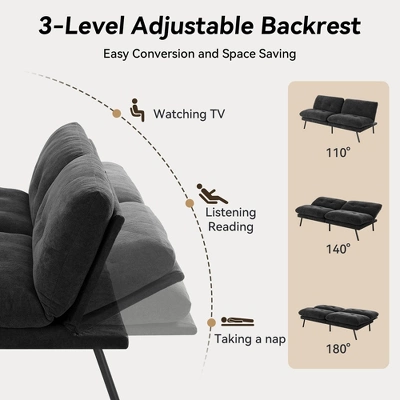Upgrade your space with our versatile convertible sofa bed,designed for both comfort and functionality.Featuring a 3-position adjustable backrest, it effortlessly transitions from a cozy sofa to a spacious bed¡ªperfect for lounging, sitting, or sleeping.The 6.7-inch high-density foam provides exceptional support, ensuring restful sleep, while the ultra-soft, breathable terry cloth fabric offers skin-friendly comfort that resists pilling.Practicality meets style with removable, machine-washable covers and a non-slip rubberized base for stability on any floor.Its modern minimalist design with steel legs blends seamlessly into any decor,making it ideal for small apartments, guest rooms, dorms,or offices.With a 600 lb weight capacity and compact dimensions (sofa: 71.29″ L x 31.1″ W; bed: 71.29″ L x 38″ W), this sofa bed maximizes space without sacrificing durability.Note: For best results, pat the vacuum-packed cushions firmly upon arrival¡ªthey’ll reach full plumpness in 2-3 days.