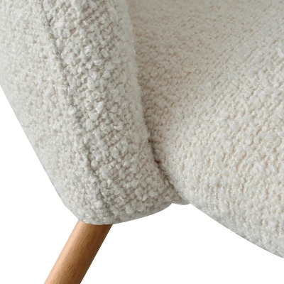 The Boucle Dining Chair Set of 6 is a stunning addition to any dining area. Each chair is crafted with a sturdy oak metal frame and features a comfortable foam seat padding. The luxurious boucle upholstery adds a touch of elegance and sophistication to the chairs.With their elegantly curved seatbacks and sleek design, these chairs effortlessly blend a contemporary style with a touch of mid-century modern charm. The oak metal legs provide sturdy support and complement the overall aesthetic of the chairs.To ensure the protection of your floors, each chair is equipped with plastic glides on their feet, preventing scratches and scuffs. Whether you’re hosting guests or enjoying intimate family meals, these Boucle Dining Chairs offer both style and comfort.Their versatile design allows them to seamlessly fit into any decor style, making them a perfect choice for any dining space. The cozy and inviting boucle upholstery adds an extra layer of comfort, inviting you to sit back and relax in style. Elevate the ambiance and comfort of your dining area with this exquisite set of Boucle Dining Chairs with Oak Metal Legs.
