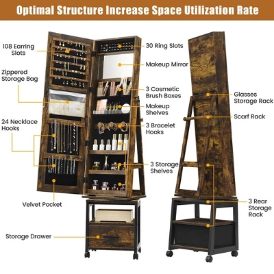 - 【4-in-1 Functional Design】The 360° Swivel Mirrored Jewelry Cabinet combines a full length mirror, a multifunctional storage shelf, jewelry organizer and makeup vanity all in one. With its smart layout and thoughtful design, it maximizes space utilization to meet your growing storage needs efficiently.