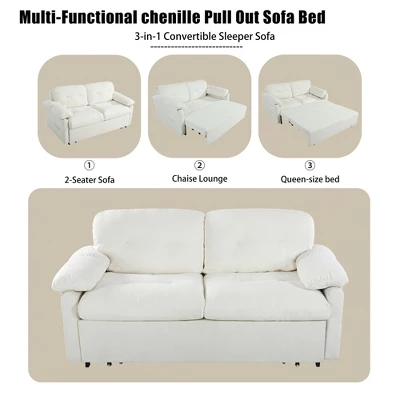 This multifunctional 3-in-1 sleeper sofa easily converts from a loveseat to a chaise lounge or a queen-size bed with a pull-out frame and adjustable lengths. Built with smooth-rolling wheels, a sturdy steel frame, and stabilizing legs, it offers reliable support and effortless transformation. Upholstered in soft chenille, it features high-resilience sponge cushions that provide breathable comfort without sagging. A built-in side pocket offers convenient storage for everyday essentials like remotes or books, combining comfort, durability, and practical design in one space-saving, stylish furniture piece.