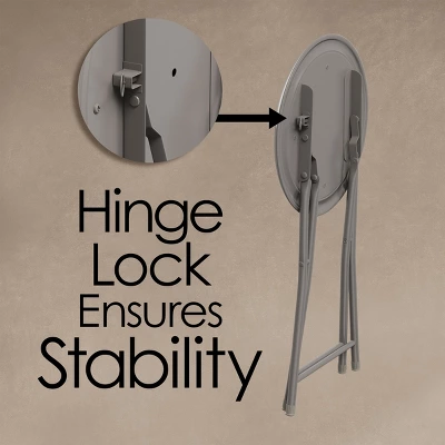 - PRODUCT DETAILS – Materials: PVC and Steel. Dimensions: Open: (L) 12″ x (W) 11.75″ x (H) 18″; Folded: (L) 12.5″ x (W) 2″ x (H) 28″; Seat Diameter: 12.5″. 300-Pound Weight Capacity. Intended For Indoor Use Only. Color: Royal and Gray.