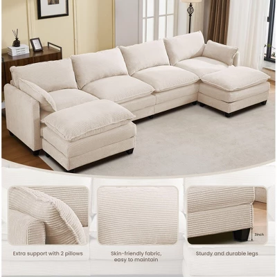 - U-Shaped Comfort for Families – Spacious 4-seater corduroy sectional sofa with 2 movable ottomans, perfect for living room gatherings.