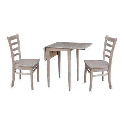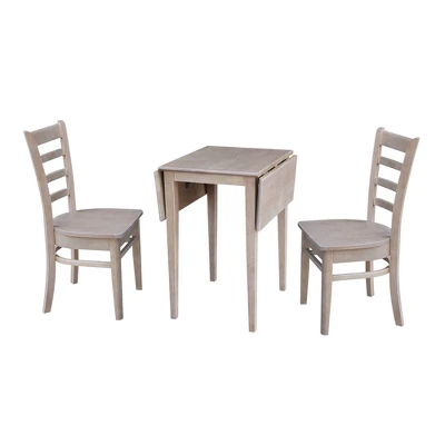 International Concepts home furniture is for those who appreciate high quality, wood furniture with a traditional and elegant look. This piece will beautifully complement your kitchen or dining room. This three piece set includes 1 dual drop-leaf dining table and 2 chairs. The table measures 20.6″W x 36″D x 29″H. It has 9″ drop leafs on each side with a 18″ center section. It has four shaker-styled legs for maximum support. The chairs measure 17″W x 21.3″D x 36″H with a 17.7″ seat height. They feature box seat construction for easy assembly. The set is made of solid wood with a butcher block surface. It has a washed, gray taupe finish, and ships ready to assemble.