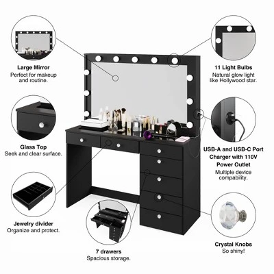 Crafted with elegance and functionality in mind, this vanity with a big vanity mirror and 11 built-in lights will effortlessly blend with any decor. The 7 drawers provide ample storage space for all your beauty essentials, keeping them organized and easily accessible.