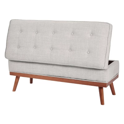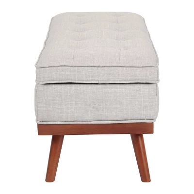 Modern retro. Update your front entry with a mid-century modern statement piece that doubles as extra home storage. This plush storage bench sets the mood as guests enter your home and offers a spot for purses, backpacks, or shoes to be placed. Modern, solid wood legs provide stability, while the hinged top allows for easy access to the storage space. Awaken your homes style with the Katheryn storage bench.