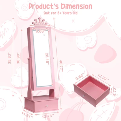 Make dress-up magical with this kids¡¯ jewelry armoire cabinet, designed with a full-length mirror and enchanting princess-themed details. Standing 46″ tall, it features LED lighting, a crown-shaped mirror, and adjustable tilt for the perfect view. Inside, kids can neatly organize their treasures with ring boards, necklace and collection hooks, earring racks, storage shelves, and 3 drawers. Safety comes first with ASTM & CPSIA certification, anti-toppling design, and protective lining to keep jewelry safe. A whimsical yet practical gift, it adds charm, creativity, and organization to any girl¡¯s room.