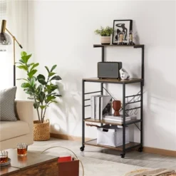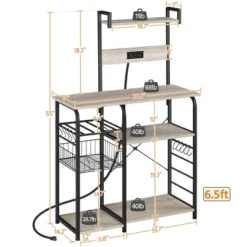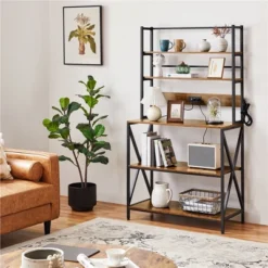 Yaheetech 5-Tier 56″ H Baker’s Rack With Wire Basket & Power Outlets, Rustic Brown