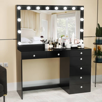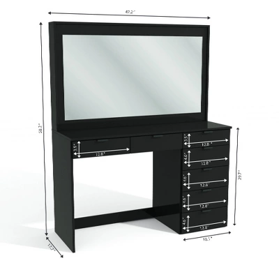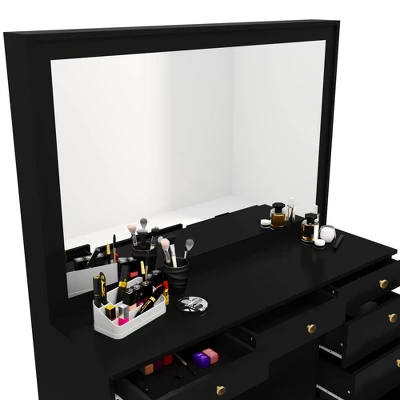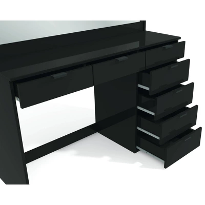 Feel like a movie star before the best performance with the Boahaus Medusa Dressing table. This spectacular dresser with mirror for bedroom brings a clean and modern style to your bedroom. This vanity with drawers is made of manufactured wood with a vanity white melamine veneer, it gives a symmetrical silhouette. This makeup table features an astonishing number of seven drawers with crystal ball knobs where you can store everything you need for your daily life. From jewelry to documents, it will be safe and organized in this black makeup vanity drawer. The top of the vanity desk is ideal to place memorable souvenirs, work on your laptop and enjoy looking at yourself in the wide Hollywood mirror. This vanity set measures 57.88 H x 47.25 W x 18.31 D. The black vanity desk model does not include a glass vanity top and lights. Assembly is required.