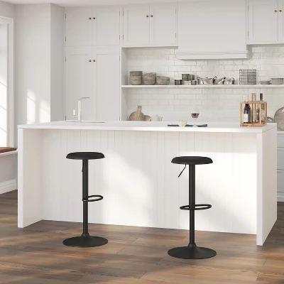 Add a retro vibe to your kitchen or dining room without sacrificing modern luxury with this ergonomic barstool with height adjustable swivel seat. An extra wide base with integrated footrest offers dependable stability and comfort while a ring underneath protects your floors and eliminates unwanted movement. Form and function beautifully blend in this stool, making it the ideal solution for your home seating needs. Additional Features: Designed for Indoor Residential Use Only, Item Size: 16″W x 16″D x 23″H; Seat Size: 13.5″W x 13.5″D x 23-31″H