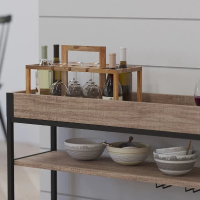 Impress your guests with this attractive bar cart featuring 3 shelves made of a luxurious blend of classic light oak wood and modern black iron. With locking wheels, this cart easily relocates and stabilizes for your convenience. Also includes an accessible stemware rack beneath the second shelf as well as a beautiful cross brace design on the bottom shelf for storing bottles of all shapes and sizes.