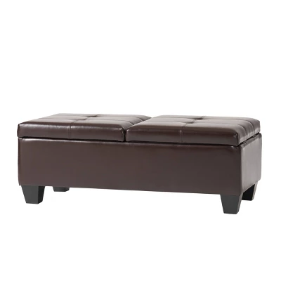 The Christopher Knight Home Merrill Double Opening Leather Storage Ottoman is beautifully covered in soft bonded leather. Gently tufted and with matching espresso legs, you will proudly display your ottoman in a prominent high-traffic area. The ottoman comes with two storage compartments so you can store blankets, games or anything else you want hidden away. This ottoman is a great way to add extra storage and seating to any room of your home. Enjoy this Christopher Knight Home Merrill Double Opening Leather Storage Ottoman in your home today.