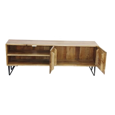 A TV Stand which is promising, trendy and space saving too. This lovely TV stand is made up of metal and mango wood. It features a nice smooth natural finish on the top and has black finish metal legs which makes this unit durable. A perfect addition to your living space or bedroom as it will enhance the whole look in an organized manner.