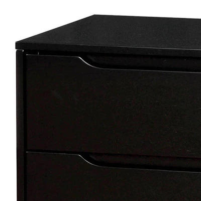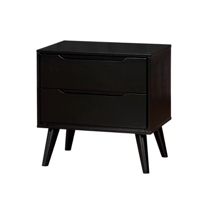 For A Quick Modern Update To Your Home, This Beautiful Nightstand will add that Mid-Century Appeal. Coordinating Case Goods Boast Slim Flared Legs And Recessed Handle Drawer Pulls. It Is Built In Wood And Has A bold black finish.
