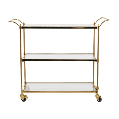 Looks stylish in your living room or kitchen as a serving tray or as a decor stand. An optimal mobility piece of furniture that will show to wow your guests for any occasion. Serve refreshments and meals with this 3-shelf bar cart that boasts style and function. This item ships in 1 carton. Suitable for indoor use only. Some assembly required. Maximum weight limit is 30 lbs. This is a single brass colored serving cart. Iron bar cart features 3 shelves. Traditional style.