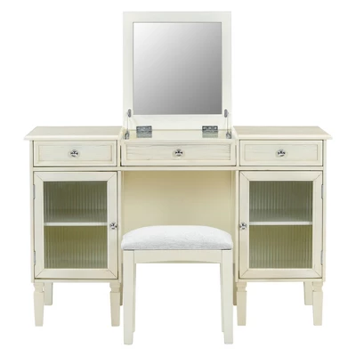 This 46.5-inch multifunctional desk is ingeniously designed with a hidden fold-down mirror in the middle layer. When the mirror is open, it transforms into a stylish dressing table; when closed, it seamlessly doubles as a spacious computer desk. The desk features a generous workspace, small storage compartments in the middle, two side drawers, and two glass-door cabinets, providing ample hierarchical storage to meet all your needs for cosmetics and office supplies. Made from high-quality, eco-friendly MDF material, the desk offers durability and stability, with solid wood legs for the table and stool. The curved corners of the desktop, simple drawer stripes, and elegant white oak finish add a touch of bright luster to any bedroom, regardless of its decor style. Whether you’re looking for a versatile piece of furniture for your home office or a chic addition to your dressing area, this desk is a perfect choice for both functionality and style!